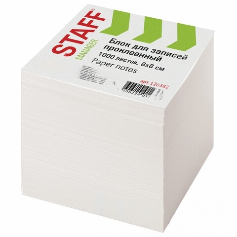 Блок для записей STAFF, проклеенный, куб 8х8 см,1000 листов, белый, белизна 90-92%, 120382