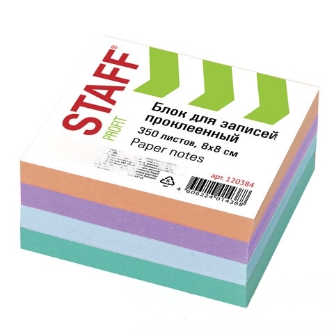 Блок для записей STAFF, проклеенный, куб 8х8 см, 350 листов, цветной, чередование с белым, 120384