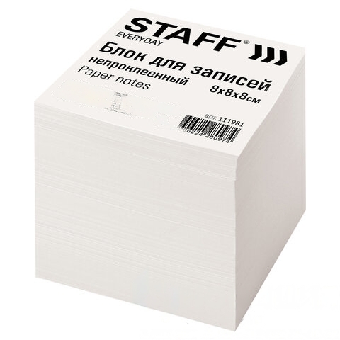 Блок для записей STAFF непроклеенный, куб 8х8х8 см, белый, белизна 70-80%, 111981