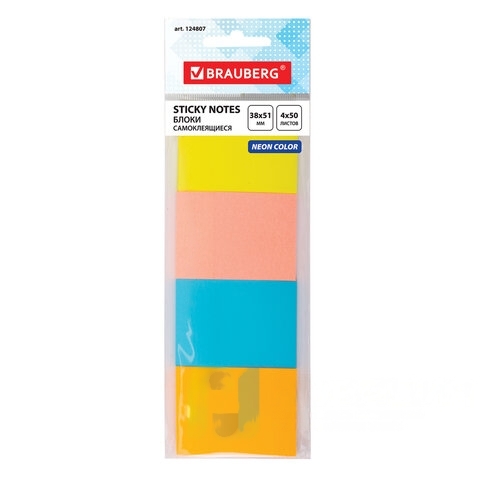 Блок самоклеящийся (стикеры), BRAUBERG, НЕОНОВЫЙ, 38х51 мм, 4 цвета х 50 листов, 124807