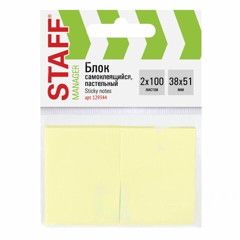Блок самоклеящийся (стикеры) STAFF, ПАСТЕЛЬНЫЙ, 38х51 мм, 100 листов, КОМПЛЕКТ 2 штуки, желтый, 129344