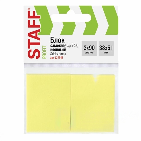 Блок самоклеящийся (стикеры) STAFF, НЕОНОВЫЙ, 38х51 мм, 90 листов, КОМПЛЕКТ 2 штуки, желтый, 129345