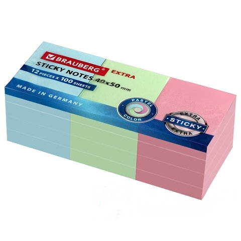 Блоки самоклеящиеся EXTRA STICKY BRAUBERG (Германия), ПАСТЕЛЬНЫЕ, 40х50 мм, НАБОР 12 шт. по 100 л., 3 цвета, 112430