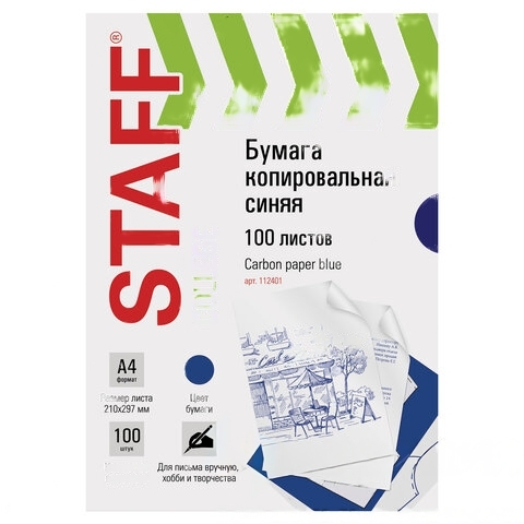 Бумага копировальная (копирка), синяя, А4, 100 листов, STAFF, 112401