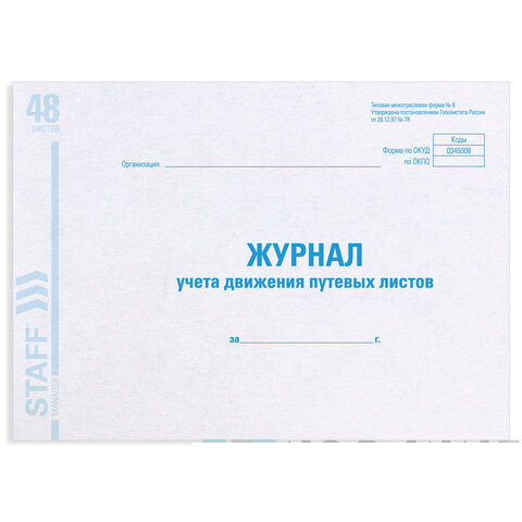 Журнал учета путевых листов форма №8, 48 л., картон, офсет, А4 (203х285 мм), STAFF, 130082