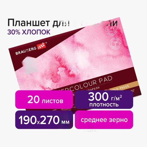 Планшет для акварели ХЛОПОК 30%, 300 г, 190х270 мм, склейка, 4 стороны, среднее зерно, 20 л., BRAUBERG ART, 113251