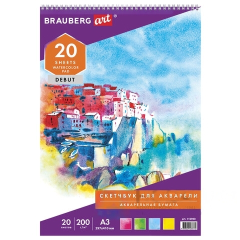 Скетчбук, акварельная белая бумага 200 г/м ГОЗНАК, 297х410 мм, 20 л., гребень, подложка, BRAUBERG ART DEBUT, 110990