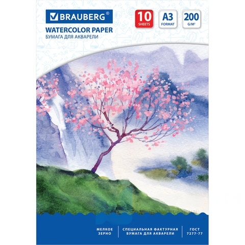 Бумага для акварели БОЛЬШАЯ А3, 10 л., 200 г/м2, 297х420 мм, BRAUBERG, "Сакура", 125224