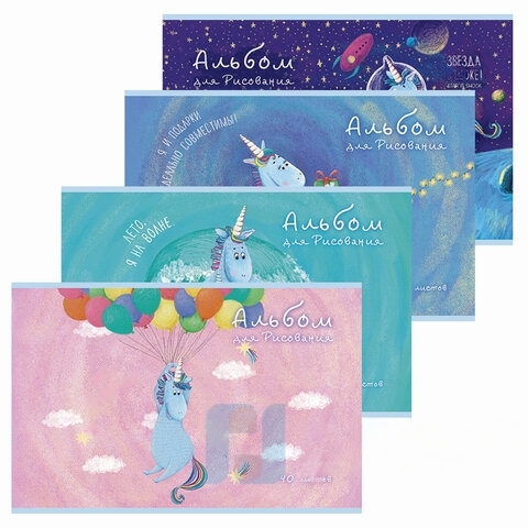 Альбом для рисования, А4, 40 листов, скоба, тиснение фольгой, ПЗБМ, 205х295 мм, "Юникорнизация" (4 вида), 049975