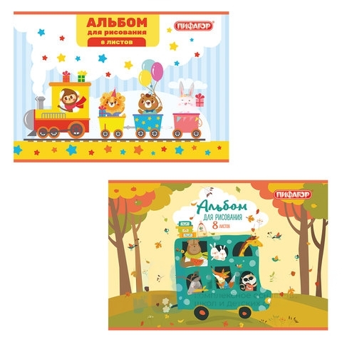 Альбом для рисования А4, 8 листов, скоба, обложка офсет, ПИФАГОР, 200х285 мм, "Веселое путешествие" (2 вида), 104850