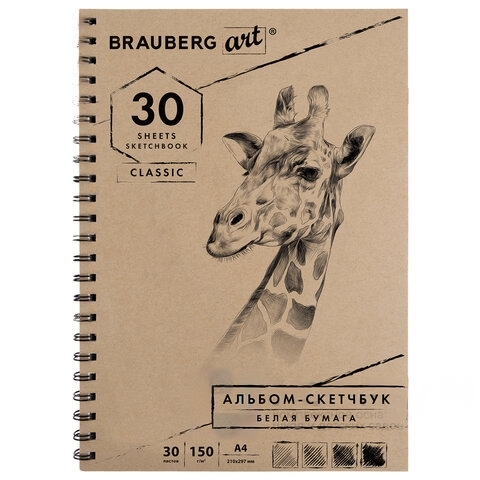 Скетчбук, белая бумага 150 г/м2, 210х297 мм, 30 л., гребень, BRAUBERG ART CLASSIC, 128949