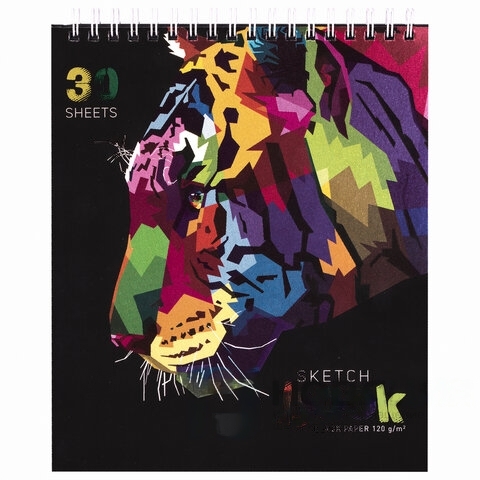 Скетчбук, черная бумага 120 г/м2, 170х195 мм, 30 л., гребень, цветная фольга, твин лак, "Тигр", 97699