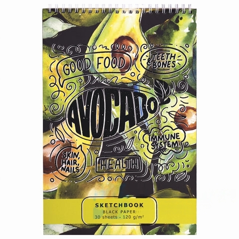 Скетчбук, черная бумага 120 г/м2, 195х300 мм, 30 л., гребень, SoftTouch, выборочный лак, "Авокадо", 97644