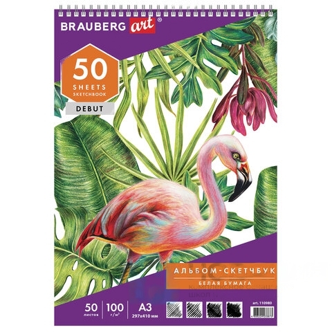 Скетчбук, белая бумага 100 г/м2, 297х410 мм, 50 л., гребень, жёсткая подложка, BRAUBERG ART DEBUT, 110980