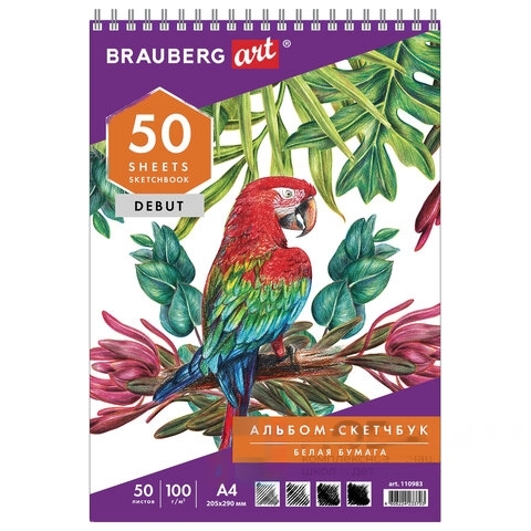 Скетчбук, белая бумага 100 г/м2, 205х290 мм, 50 л., гребень, жёсткая подложка, BRAUBERG ART DEBUT, 110983
