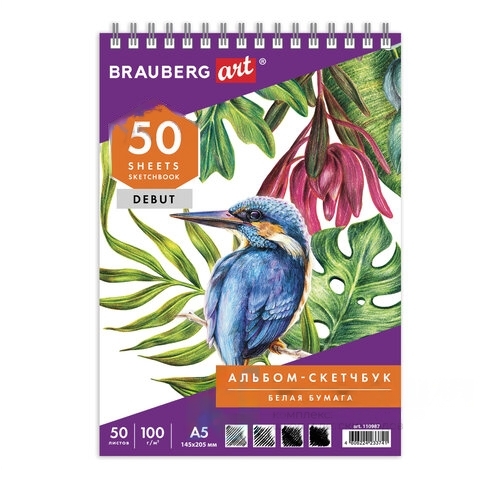 Скетчбук, белая бумага 100 г/м2, 145х205 мм, 50 л., гребень, жёсткая подложка, BRAUBERG ART DEBUT, 110987