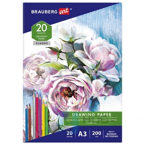 Бумага для рисования в папке БОЛЬШАЯ А3, 20 л., 200 г/м2, ВАТМАН ГОЗНАК, BRAUBERG ART CLASSIC, 114491