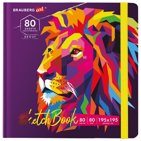 Скетчбук, белая бумага 80 г/м2, 195х195 мм, 80 л., резинка, твердый, BRAUBERG ART DEBUT "Лев", 114582