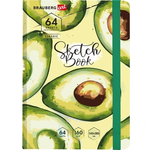 Скетчбук, белая бумага 160 г/м2, 145х203 мм, 64 л., резинка, твердый, BRAUBERG ART CLASSIC "Авокадо", 114588