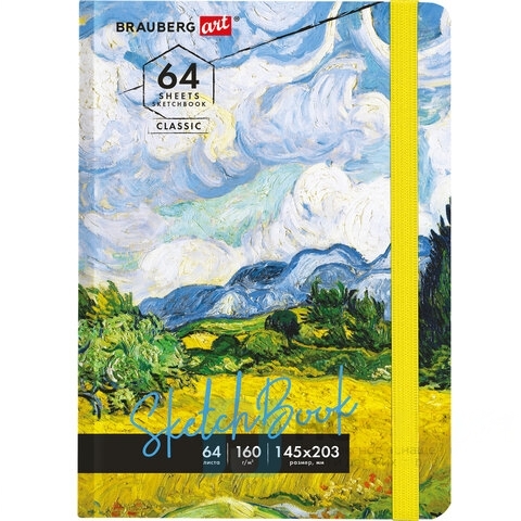 Скетчбук, белая бумага 160 г/м2, 145х203 мм, 64 л., резинка, твердый, BRAUBERG ART CLASSIC "Ван Гог", 114590