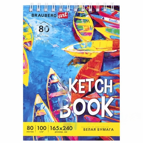 Скетчбук белая бумага 100 г/м2 165х240 мм, 80 л., гребень, твердая обложка, BRAUBERG ART DEBUT, 112985