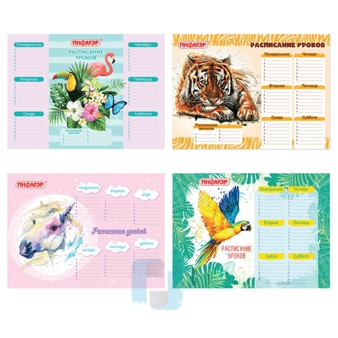 Расписание уроков и звонков А4, ПИФАГОР, "В мире животных", ассорти (4 вида), бумага 150 г/м2, 111656