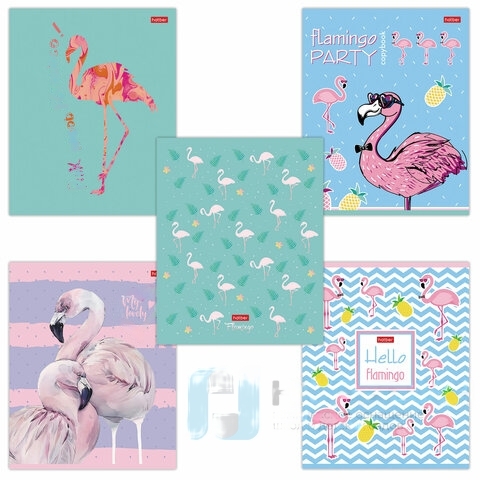 Тетрадь 18 л. HATBER скоба, клетка, обложка картон, тиснение, "Фламинго" (5 видов в спайке), 18Т5тВ1