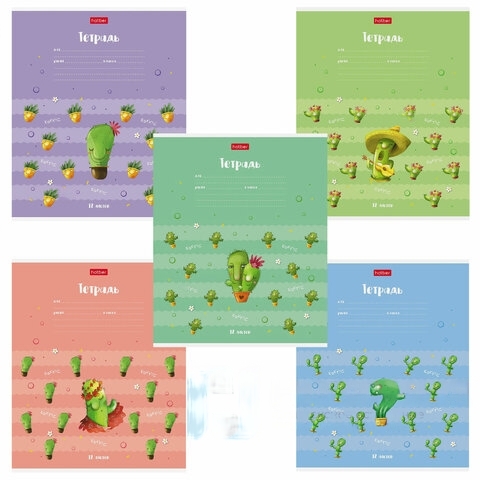 Тетрадь 12 л. HATBER клетка, обложка картон, "Мой друг Кактус" (5 видов в спайке), 12Т5В1