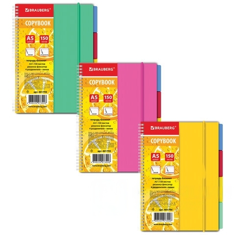 Тетрадь-блокнот 150 л., A5, 170x215 мм, BRAUBERG, линия, гребень, обложка пластиковая, на резинке, 4 разделителя, "Juicy", 401795