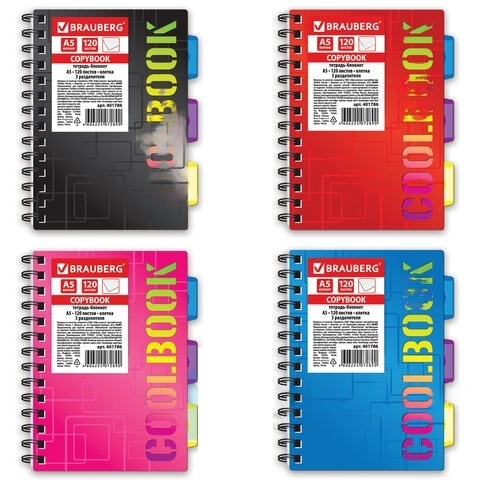 Тетрадь-блокнот 120 л., A5, 148x210 мм, BRAUBERG, клетка, гребень, обложка пластиковая, 3 разделителя, "CoolBOOK", 401786