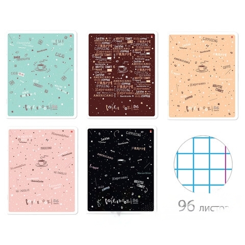 Тетрадь А5 96 л. АЛЬТ скоба, клетка, гибридный лак, "Coffe time" (5 видов), 7-96-1160