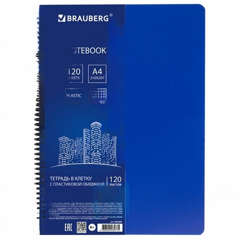 Тетрадь А4, 120 листов, BRAUBERG "Metropolis", спираль пластиковая, клетка, обложка пластик, СИНИЙ, 403389