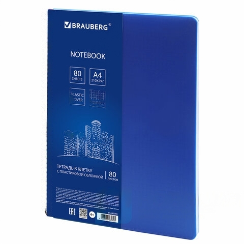Тетрадь А4, 80 листов, BRAUBERG "Metropolis", спираль пластиковая, клетка, обложка пластик, СИНИЙ, 403392