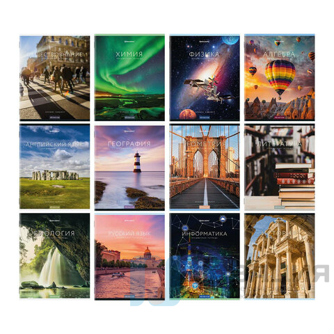 В комплекте 12 тетрадей: Алгебра, Английский язык, Биология, География, Геометрия, Обществознание, Информатика, История, Литература (в линию), Русский язык (в линию), Физика, Химия.