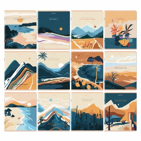 В комплекте 12 тетрадей: Алгебра, Английский язык, Биология, География, Геометрия, Обществознание, Информатика, История, Литература (в линию), Русский язык (в линию), Физика, Химия.