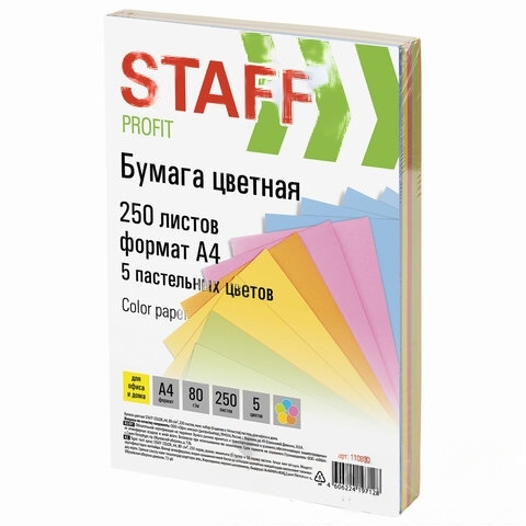 Бумага цветная STAFF "Profit", А4, 80 г/м2, 250 л. (5 цв. х 50 л.), пастель, для офиса и дома, 110890