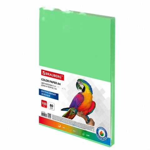 Бумага цветная BRAUBERG, А4, 80 г/м2, 100 л., интенсив, зеленая, для офисной техники, 112451