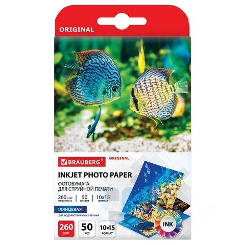 Фотобумага глянцевая, 10х15 см, 260 г/м2, односторонняя, 50 листов, BRAUBERG ORIGINAL, 363976