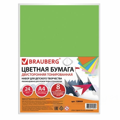 Цветная бумага А4 ТОНИРОВАННАЯ В МАССЕ, 24 листа 8 цветов (4 пастель + 4 интенсив), BRAUBERG, 200х290 мм, 128009