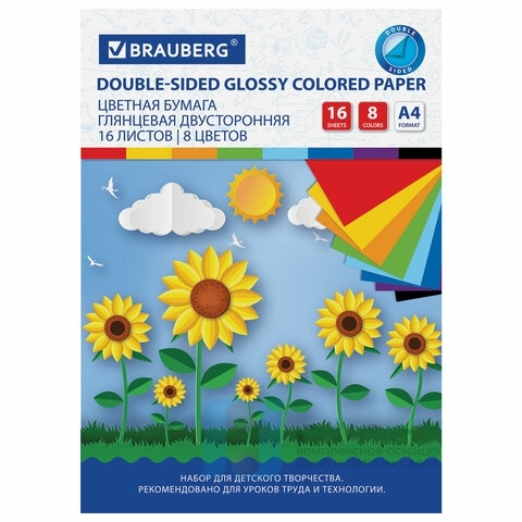 Цветная бумага А4 2-сторонняя мелованная (глянцевая), 16 листов 8 цветов, на скобе, BRAUBERG, 200х280 мм, "Подсолнухи", 129783