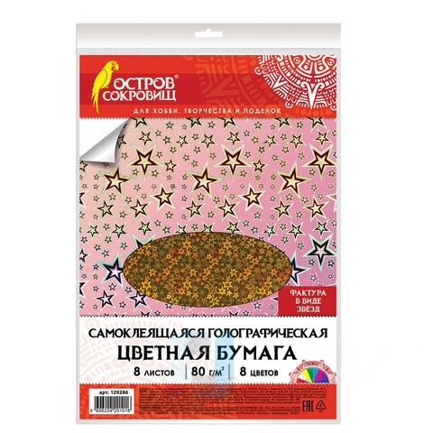 Цветная бумага, А4, ГОЛОГРАФИЧЕСКАЯ САМОКЛЕЯЩАЯСЯ, 8 листов 8 цветов, "ЗВЕЗДОЧКИ", ОСТРОВ СОКРОВИЩ, 129286