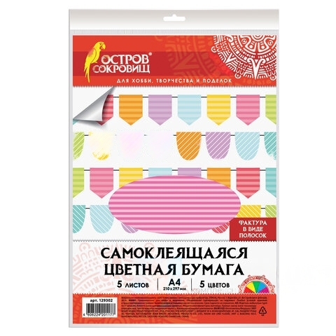 Цветная бумага, А4, офсетная САМОКЛЕЯЩАЯСЯ, 5 листов 5 цветов, "ПОЛОСКИ", 80 г/м2, ОСТРОВ СОКРОВИЩ, 210х297 мм, 129302