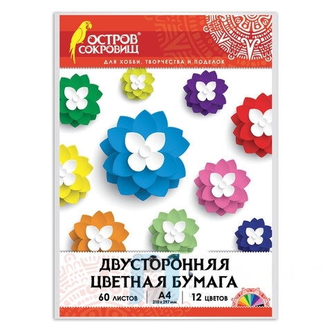 Цветная бумага, А4, ТОНИРОВАННАЯ В МАССЕ, 60 листов 12 цветов, склейка, 80 г/м2, ОСТРОВ СОКРОВИЩ, 210х297 мм, 129306