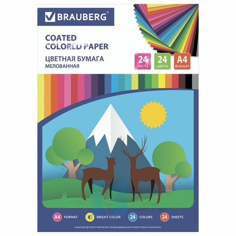 Цветная бумага, А4, мелованная, 24 листа, 24 цвета, на скобе, BRAUBERG ЭКО, 200х280 мм, "Природа", 111329