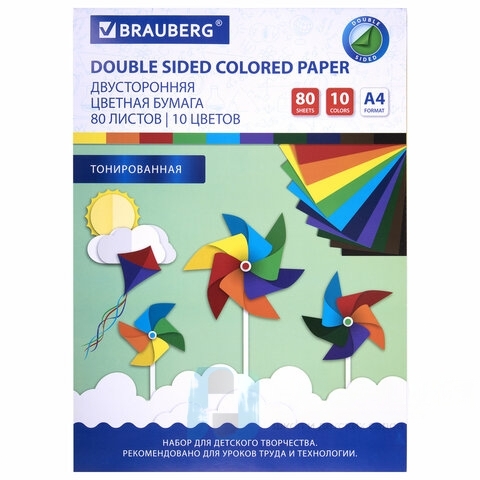 Цветная бумага А4 ТОНИРОВАННАЯ В МАССЕ, 80 листов 10 цветов, склейка, 80 г/м2, BRAUBERG, 113503