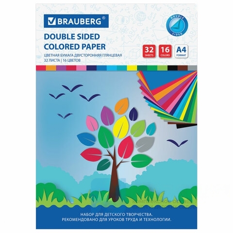 Цветная бумага А4 2-сторонняя мелованная, 32 листа 16 цветов, на скобе, BRAUBERG, 200х280 мм, "Деревце", 113537