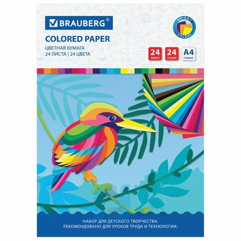 Цветная бумага А4 офсетная, 24 листа 24 цвета, на скобе, BRAUBERG, 200х280 мм, "Птица", 113538