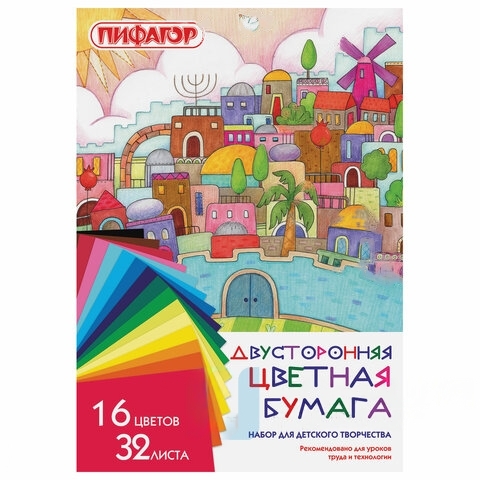 Цветная бумага А4 2-сторонняя газетная, 32 листа 16 цветов, на скобе, ПИФАГОР, 200х280 мм, "Город", 113543