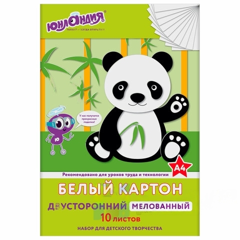 Картон белый А4 МЕЛОВАННЫЙ EXTRA (белый оборот), 10 листов папка, ЮНЛАНДИЯ, 200х290 мм, "ПАНДА", 111311
