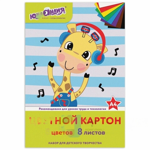 Картон цветной А4 немелованный (матовый), 8 листов 8 цветов, в папке, ЮНЛАНДИЯ, 200х290 мм, "ВЕСЕЛЫЙ ЖИРАФИК", 129568